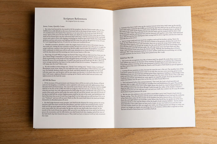 The hymns are also ordered to help us remember the story of the good news, as God calls us to Gather & Adore His glorious attributes, then Confess & Lament the sin within us and around us in the world. From that place of need we look to the cross of Christ for our Assurance & Comfort, and finally, we Respond & Hope, seeking to follow Jesus until He comes again soon. Near the end of these hymnbooks you will also find Scripture references for the original lyrics.